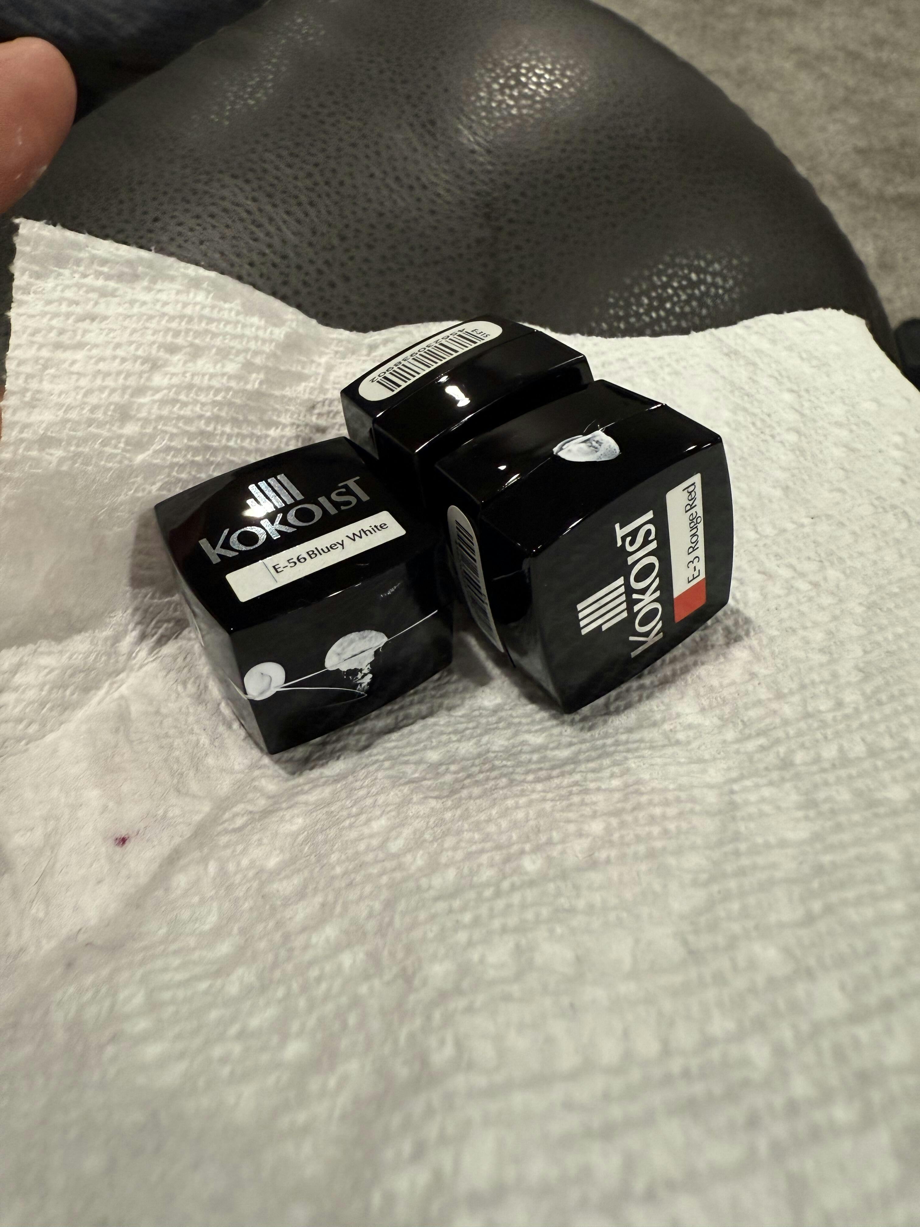 - 2.5g Color Gels: E-3 Rogue Red, E-56 Bluey White, E-148 Blackest Black, and E-173 Peanut Butter Toffee